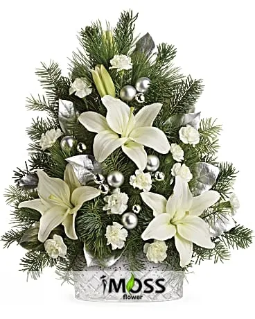 Beyaz Lilyum Yeni Yıl Aranjmanı Tasarım 'da kullanılan çiçek ve aksesuarlar stok durumuna göre farklılık gösterilebilir.