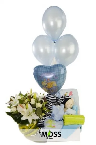 Erkek Bebek Aranjmanı Tasarım 'da kullanılan çiçek ve aksesuarlar stok durumuna göre farklılık gösterilebilir.