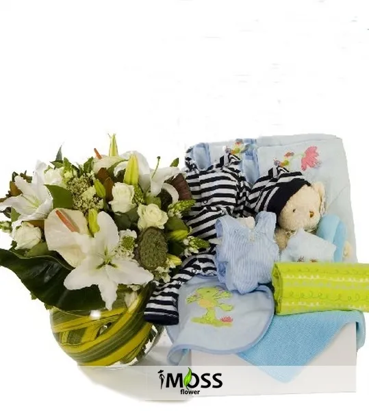 Erkek Bebek Aranjmanı Tasarım 'da kullanılan çiçek ve aksesuarlar stok durumuna göre farklılık gösterilebilir.