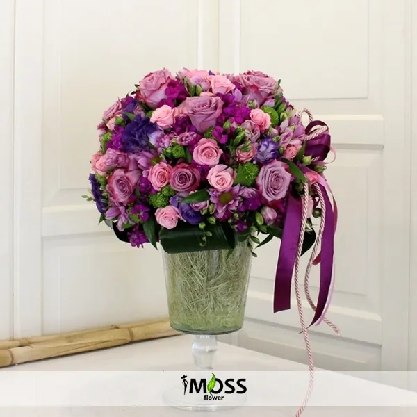kadeh vazoda mor ton güller Tasarım 'da kullanılan çiçek ve aksesuarlar stok durumuna göre farklılık gösterilebilir.