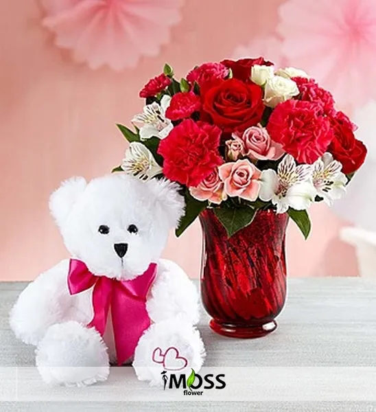 Kırmızı Vazoda Güller Ve Şirin Ayıcık Tasarım 'da kullanılan çiçek ve aksesuarlar stok durumuna göre farklılık gösterilebilir.