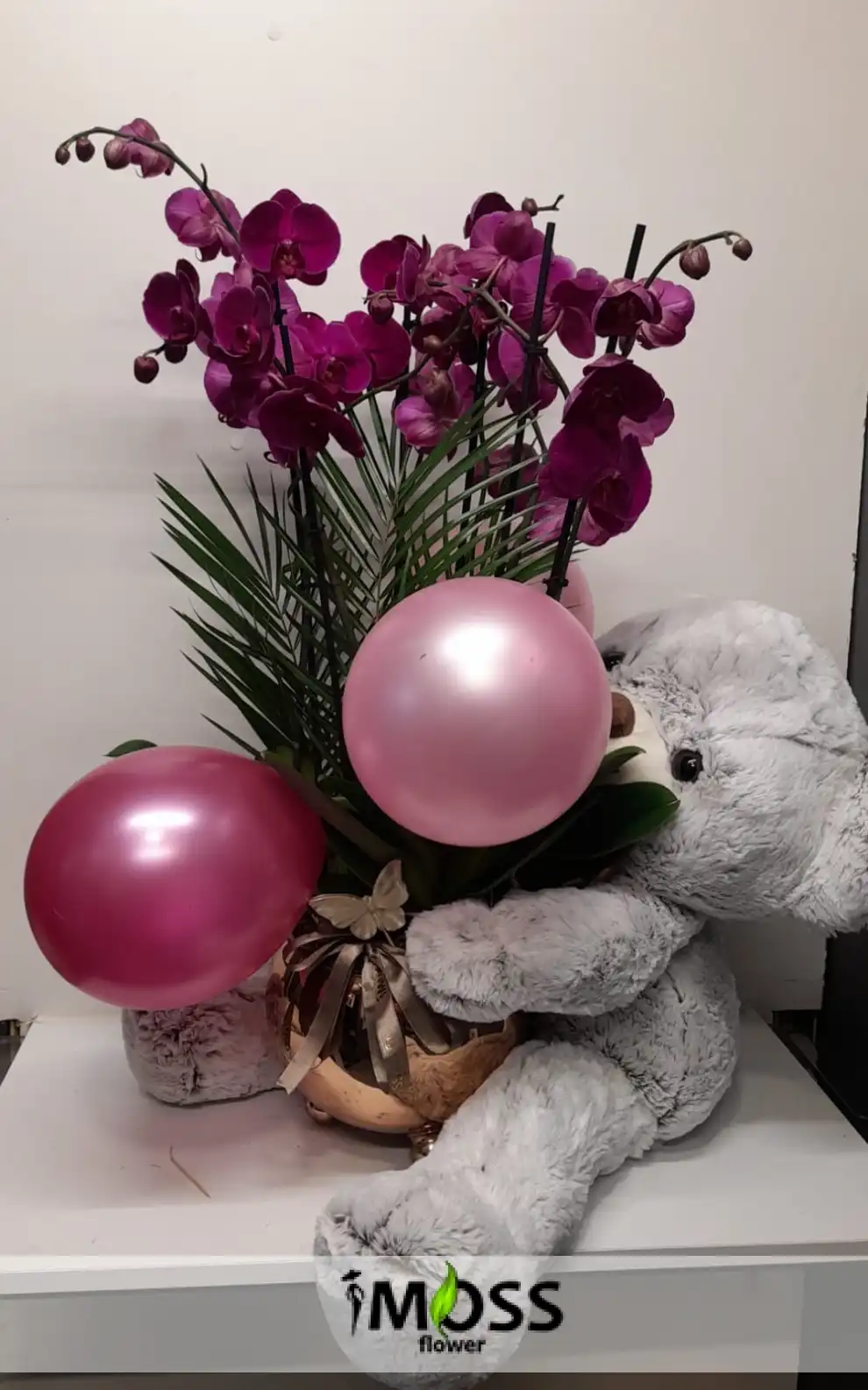 Ayıcık Kucağında 4 Dal Orkide Ve Balonlar