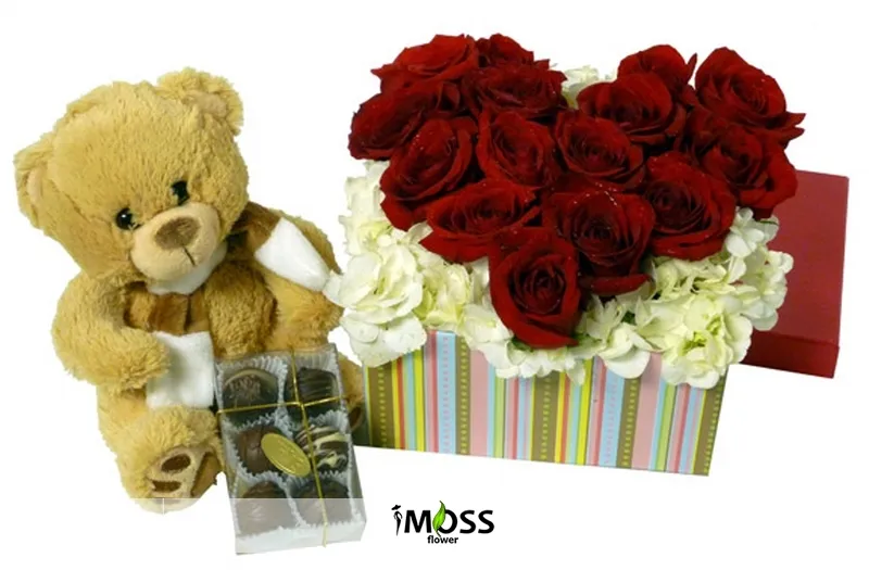KUTUDA KIRMIZI GULLER AYICIK VE ÇİKOLATA