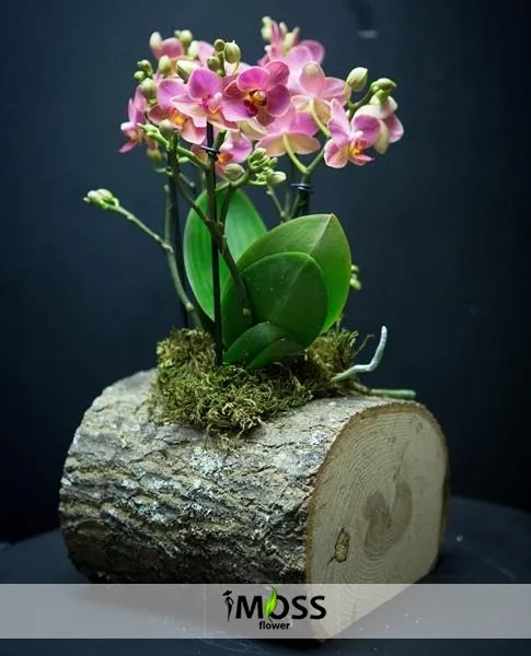 Kütükte Pembe Orkideler Tasarım 'da kullanılan çiçek ve aksesuarlar stok durumuna göre farklılık gösterilebilir.