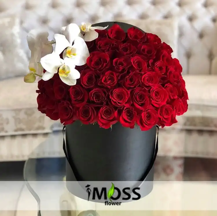 Siyah kadife kutu içerisinde 51 adet ithal kırmızı gül üzeri beyaz orkide
